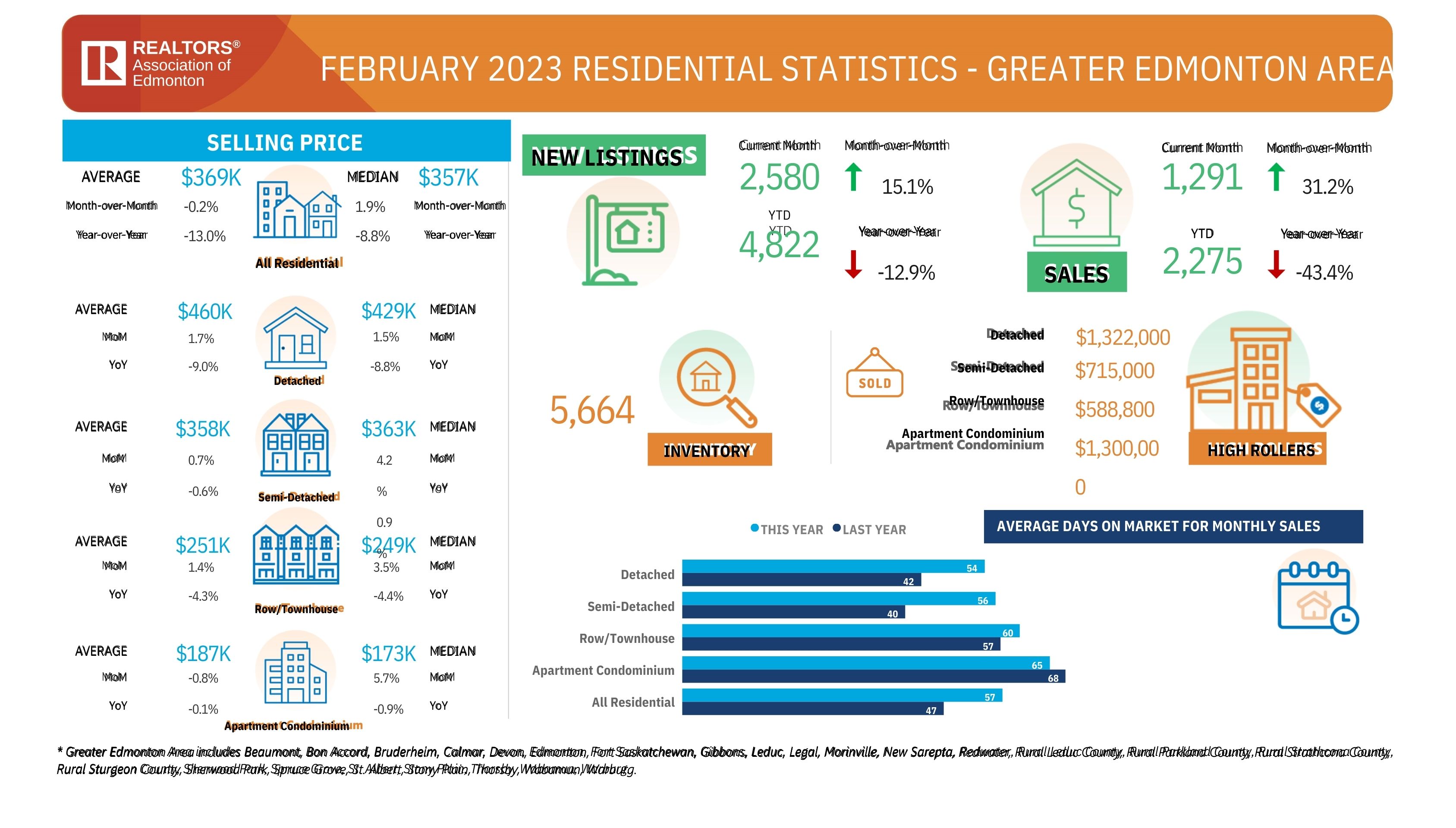 “While numbers are not quite where they were at this time last year, we’re still seeing large percentage increases month-over-month in many of the categories,” says REALTORS® Association of Edmonton 2023 Board Chair Melanie Boles. “There are lots to look forward to as we head into the warmer months and we’re feeling optimistic as we set our sights on the Spring market.”