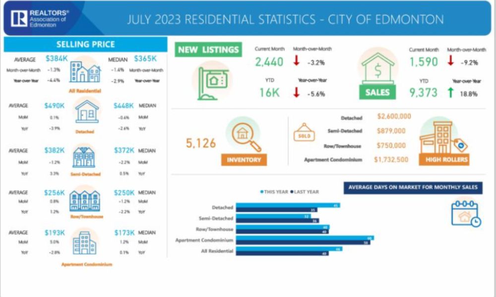 "In July 2023, according to Melanie Boles, Chair of the 2023 Board of REALTORS® Association of Edmonton, we observed a slight decrease in average prices for both detached properties and apartment condominiums compared to the same period last year. However, semi-detached homes and row/townhouses experienced a positive uptick in their average prices. Furthermore, July witnessed an increase in sales across all property categories, with apartment condominiums taking the lead, boasting a remarkable 31.6% surge compared to July 2022."