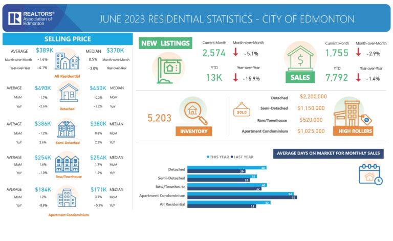 “While we’ve noted that market activity has cooled heading into the summer months, we’ve seen slight improvements in average prices across several categories,” says REALTORS® Association of Edmonton 2023 Board Chair Melanie Boles. “Although detached homes saw a decrease of 2.7% from May 2023, semi-detached homes, row/townhouses, and apartment condominiums all saw slight improvements in their average prices from the previous month.”