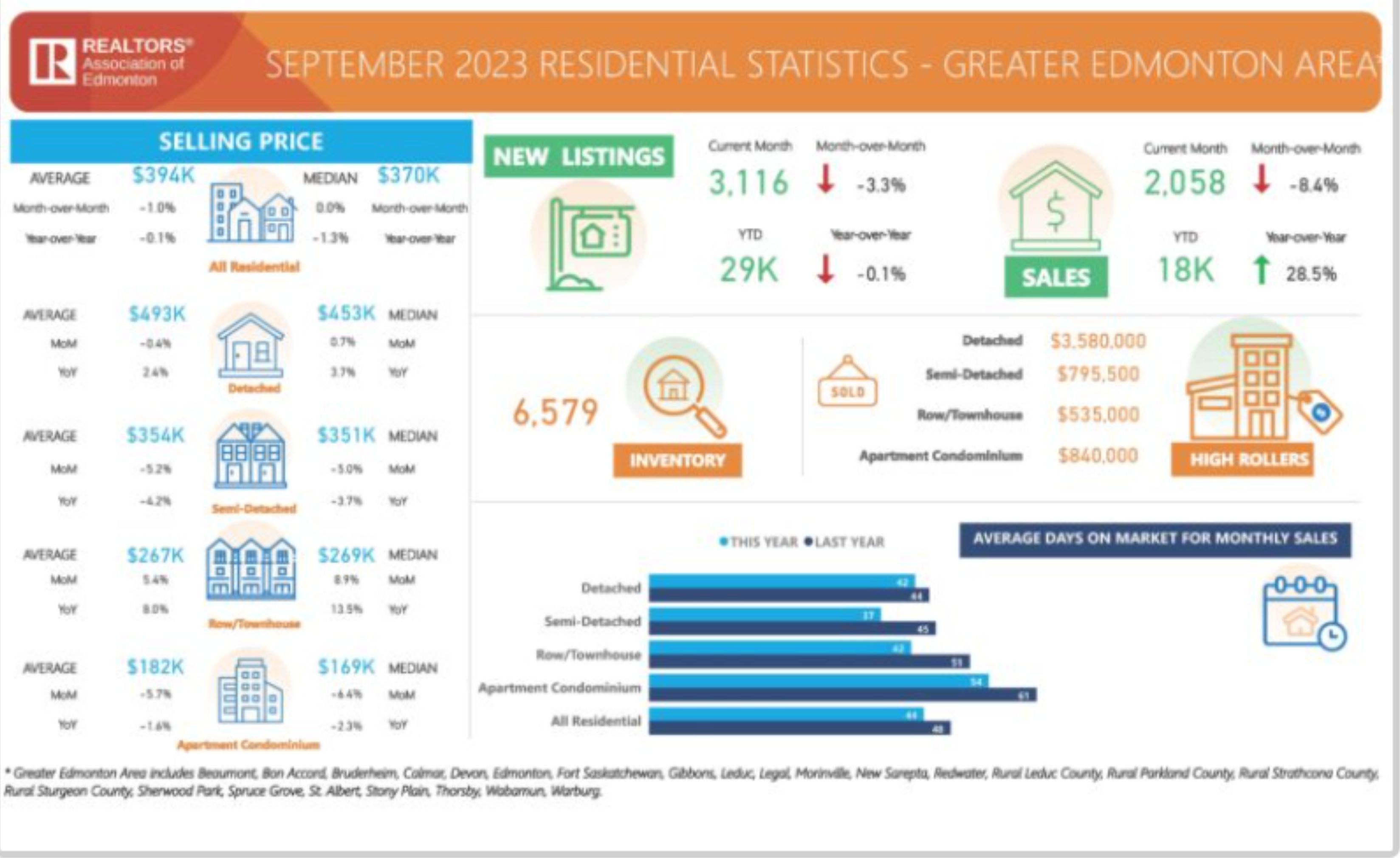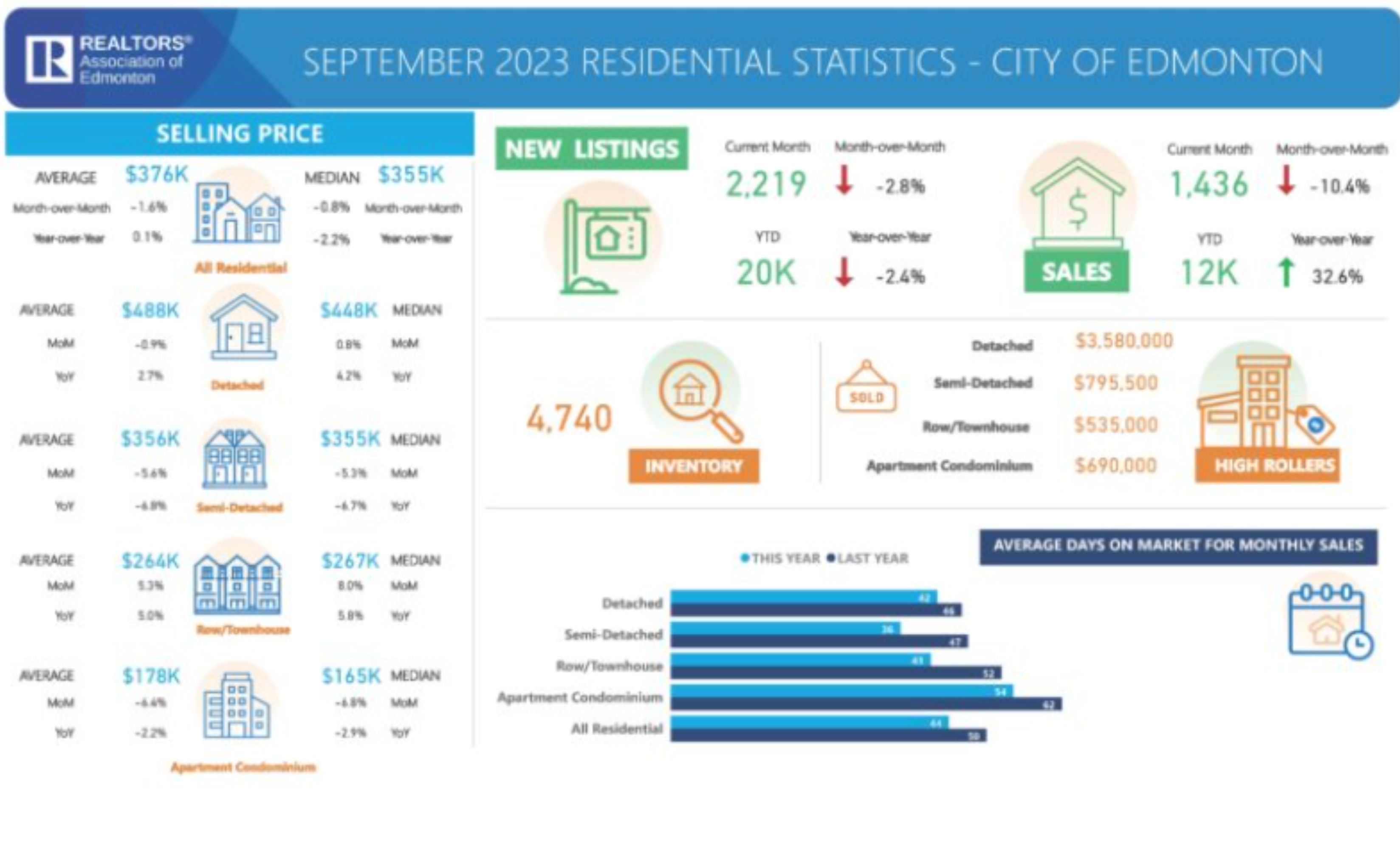 “We’re continuing to see the trend of a higher number of sales happening in 2023 compared to last year, but the market is still slowing down for autumn. Sales in almost every category fell from the previous month,” says REALTORS® Association of Edmonton 2023 Board Chair Melanie Boles. “Sellers hoping to close before the holidays have lower available inventory on their side, but they will have to contend with higher buyer uncertainty from the Bank of Canada’s looming October announcement about interest rates.