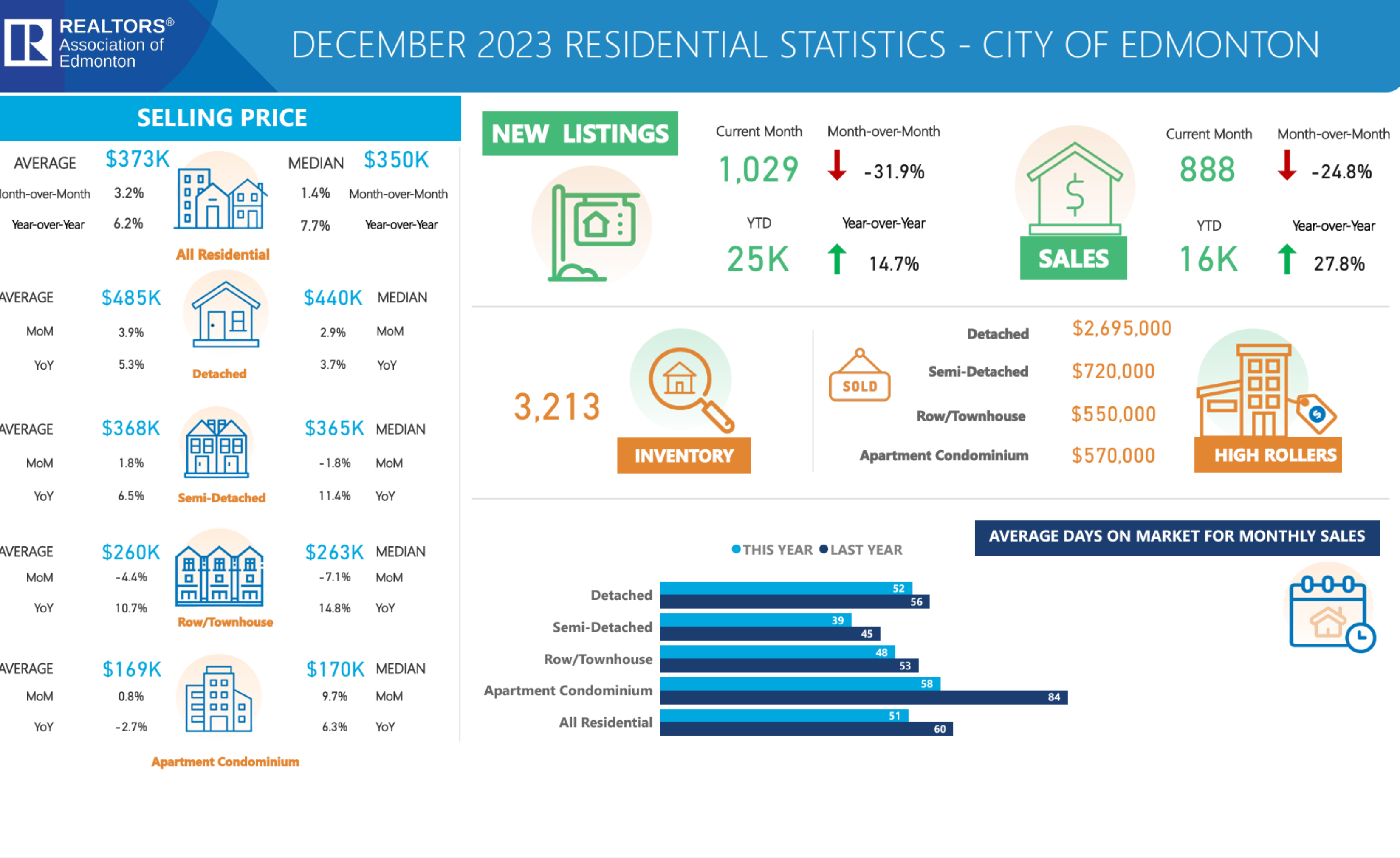 “Though December’s month-over-month numbers are higher than in 2022, the strong second half of this year hasn’t quite achieved the level of activity seen in the previous year,” says REALTORS® Association of Edmonton 2023 Board Chair Melanie Boles. “As the year closes, the year-to-date average selling price is $398,735, compared with $415,115 in 2022, and year-to-date average unit sales are still lagging by 8%.”
